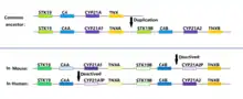 In the mouse genome, the Cyp21a2 is a pseudogene and the Cyp21a1 is a functional gene.[25] In the chicken and quail, there is only a single Cyp21 gene, which locus is located between complement component C4 and TNX gene, along with Cenpa.[26]