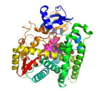 Structurally, the protein contains an evolutionarily conserved core of four α-helix bundles (the importance of such genetic conservation is in demonstrating the functional importance of this aspect of this protein's structure). In addition, it has two additional alpha helices, two sets of β-sheets, and a heme cofactor binding loop.[46] Each subunit in the human enzyme consists of a total of 13 α-helices and 9 β-strands that folds into a triangular prism-like tertiary structure.[12]