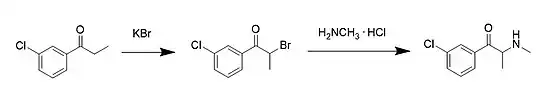 The first step is to produce 2-bromo-3-chloropropiophenone by the bromination of 3-chloro-propiophenone at the alpha-position under acidic or basic conditions. The second step involves an animation reaction using methylamine hydrochloride, after which the final compound can be recrystallized and collected. The product is obtained in a racemic mixture. Cathinones are usually unstable compounds as a free base, so the final product is usually isolated and obtained as a chlorohydrate.[2]