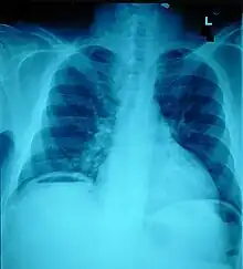 The small intestine takes up a large part of the abdomen and is likely to be damaged in penetrating injury.[5] The bowel may be perforated.[4] Gas within the abdominal cavity seen on CT is understood to be a diagnostic sign of bowel perforation; however intra-abdominal air can also be caused by pneumothorax (air in the pleural cavity outside the lungs that has escaped from the respiratory system) or pneumomediastinum (air in the mediastinum, the center of the chest cavity).[4] The injury may not be detected on CT.[4] Bowel injury may be associated with complications such as infection, abscess, bowel obstruction, and the formation of a fistula.[4] Bowel perforation requires surgery.[4]