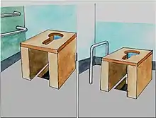 Toilets in private homes can be modified to increase accessibility; this is one of the skills of an occupational therapist.[1] Common modifications include: adding a raised toilet seat on top of a standard toilet, installing a taller and more convenient height toilet bowl, attaching a frame or grab bars, and ensuring the toilet paper is within reach and can be detached with one hand. These modifications can enable aging in place for seniors who wish to remain in their homes and communities.