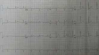 | An ECG showing pericarditis. Note the ST elevation in multiple leads with slight reciprocal ST depression in aVR. | |