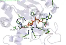 Phosphoryl transfer only occurs on closing of the 'open lid'. This causes an exclusion of water molecules that brings the substrates in proximity to each other,[7] lowering the energy barrier for the nucleophilic attack by the α-phosphoryl of AMP on the γ-phosphoryl group of ATP resulting in formation of ADP by transfer of the γ-phosphoryl group to AMP. In the crystal structure of the ADK enzyme from E. coli with inhibitor Ap5A, the Arg88 residue binds the Ap5A at the α-phosphate group. It has been shown that the mutation R88G results in 99% loss of catalytic activity of this enzyme, suggesting that this residue is intimately involved in the phosphoryl transfer.[8] Another highly conserved residue is Arg119, which lies in the adenosine binding region of the ADK, and acts to sandwich the adenine in the active site. It has been suggested that the promiscuity of these enzymes in accepting other NTP's is due to this relatively inconsequential interactions of the base in the ATP binding pocket.[9] A network of positive, conserved residues (Lys13, Arg123, Arg156, and Arg167 in ADK from E. coli) stabilize the buildup of negative charge on phosphoryl group during the transfer. Two distal aspartate residues bind to the arginine network, causing the enzyme to fold and reduces its flexibility. A magnesium cofactor is also required, essential for increasing the electrophilicity of the phosphate on AMP, though this magnesium ion is only held in the active pocket by electrostatic interactions and dissociates easily.[9]