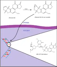 Aflatoxin B1 is a potent genotoxic hepatocarcinogen with its exposure strongly linked to the development of hepatocellular carcinoma, liver tumors, especially given co-infection with hepatitis B virus.[18] These effects seem to be largely mediated by mutations at guanine in codon 249 of the p53 gene, a tumor suppressing gene,[30] and at several guanine residues in the 12th and 13th codons of the ras gene, a gene whose product controls cellular proliferation signals.[31][32] Aflatoxin B1 must first be metabolized into its reactive electrophilic form, aflatoxin B1-8,9-exo-epoxide by cytochrome p450.[18] This active form then intercalates between DNA base residues and forms adducts with guanine residues, most commonly aflatoxin B1-N7-Gua. These adducts may then rearrange or become removed from the backbone all-together, forming an apurinic site. These adducts and alterations represent lesions which, upon DNA replication cause the insertion of a mis-matched base in the opposing strand. Up to 44% of hepatocellular carcinomas in regions with high aflatoxin exposure bear a GC → TA transversion at codon 249 of p53, a characteristic mutation seen with this toxin.[32]