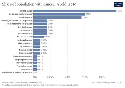 Worldwide, alcohol consumption causes approximately 144,000 women to be diagnosed with breast cancer each year.[5] Approximately 38,000 women die from alcohol-induced breast cancer each year.[5] About 80% of these women were heavy or moderate drinkers.[5]
