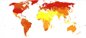 There are genetic variations that affect the risk for alcoholism.[75][74][90][91] Some of these variations are more common in individuals with ancestry from certain areas, for example Africa, East Asia, the Middle East and Europe. The variants with strongest effect are in genes that encode the main enzymes of alcohol metabolism, ADH1B and ALDH2.[75][90][91] These genetic factors influence the rate at which alcohol and its initial metabolic product, acetaldehyde, are metabolized.[75] They are found at different frequencies in people from different parts of the world.[92][75][93] The alcohol dehydrogenase allele ADH1B*2 causes a more rapid metabolism of alcohol to acetaldehyde, and reduces risk for alcoholism;[75] it is most common in individuals from East Asia and the Middle East. The alcohol dehydrogenase allele ADH1B*3 causes a more rapid metabolism of alcohol. The allele ADH1B*3 is only found in some individuals of African descent and certain Native American tribes. African Americans and Native Americans with this allele have a reduced risk of developing alcoholism.[75][93][94] Native Americans, however, have a significantly higher rate of alcoholism than average; risk factors such as cultural environmental effects e.g. trauma have been proposed to explain the higher rates.[95][96] The aldehyde dehydrogenase allele ALDH2*2 greatly reduces the rate at which acetaldehyde, the initial product of alcohol metabolism, is removed by conversion to acetate; it greatly reduces the risk for alcoholism.[75][92]