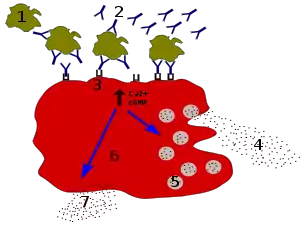 Degranulation process in allergy. Second exposure to allergen. 1 – antigen; 2 – IgE antibody; 3 – FcεRI receptor; 4 – preformed mediators (histamine, proteases, chemokines, heparin); 5 – granules; 6mast cell; 7 – newly formed mediators (prostaglandins, leukotrienes, thromboxanes, PAF).