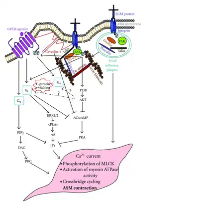 The structure of α receptors is a classic G protein–coupled receptors (GPCRs) consisting of 7 transmembrane domains, which form three intracellular loops and three extracellular loops.[2] These receptors couple to heterotrimeric G proteins composed of α, β, and γ subunits.[2] Although both of the α receptors are GPCRs, there are large differences in their mechanism of action. Specifically, α1 receptors are characterized as Gq GPCRs, signaling through Phospholipase C to increase IP3 and DAG, thus increasing the release of calcium. Meanwhile, α2 receptors are labeled as Gi GPCRs, which signal through adenylyl cyclase to decrease cAMP.[38]