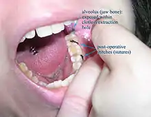 | Alveolar osteitis of a socket after extraction of all maxillary teeth; note lack of blood clot in socket and exposed alveolar bone | |