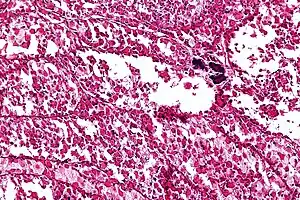 | Micrograph of an alveolar soft part sarcoma, showing the characteristic alveolar-like architecture and cells with eccentric nuclei and abundant eosinophilic cytoplasm. H&E stain. | |