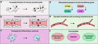 Research has shown that there is a link between prior infection with certain viruses and the development of neurodegenerative diseases later in life.[14] This extends to AD, where infection with viruses such as herpes simplex virus (HSV), varicella zoster virus (VZV), or Epstein-Barr virus (EBV), among others, increases risk of developing AD.[15] In a study of 6,245,282 patients, it was observed that cognitively normal individuals over 65 are at an increased risk of a new dementia diagnosis following COVID-19 infection.[16] Moreover, COVID-19 has been shown to potentially exacerbate the progression of existing AD, leading to increased research interest into the interaction between the two diseases[1]