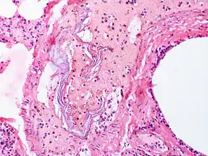 | Skin cells are present in the blood vessels of this case of amniotic fluid embolism. | |