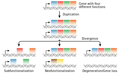Subfunctionalization can occur through neutral processes in which mutations accumulate with no detrimental or beneficial effects. However, in some cases subfunctionalization can occur with clear adaptive benefits. If an ancestral gene is pleiotropic and performs two functions, often neither one of these two functions can be changed without affecting the other function. In this way, partitioning the ancestral functions into two separate genes can allow for adaptive specialization of subfunctions, thereby providing an adaptive benefit.[31]