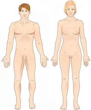 Because animals can change orientation with respect to their environment, and because appendages like limbs and tentacles can change position with respect to the main body, terms to describe position need to refer to an animal when it is in its standard anatomical position.[1] This means descriptions as if the organism is in its standard anatomical position, even when the organism in question has appendages in another position. This helps avoid confusion in terminology when referring to the same organism in different postures.[1] In humans, this refers to the body in a standing position with arms at the side and palms facing forward, with thumbs out and to the sides.[2][1]