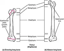 | epiphysis | The end regions of a long bone; regions of secondary ossification. | epi- + physis, "on top of the growth part" |