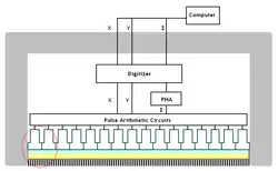 The location of the interaction between the gamma ray and the crystal can be determined by processing the voltage signals from the photomultipliers; in simple terms, the location can be found by weighting the position of each photomultiplier tube by the strength of its signal, and then calculating a mean position from the weighted positions.[2]:112 The total sum of the voltages from each photomultiplier, measured by a pulse height analyzer is proportional to the energy of the gamma ray interaction, thus allowing discrimination between different isotopes or between scattered and direct photons.[6]:166