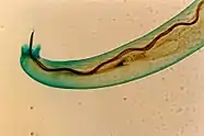 | Adult female worm of Angiostrongylus cantonensis with characteristic barber-pole appearance (anterior end of worm is to the top). Scale bar is 1 mm. | |