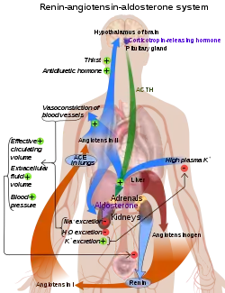 Angiotensin-converting enzyme (EC 3.4.15.1), or ACE, is a central component of the renin–angiotensin system (RAS), which controls blood pressure by regulating the volume of fluids in the body. It converts the hormone angiotensin I to the active vasoconstrictor angiotensin II. Therefore, ACE indirectly increases blood pressure by causing blood vessels to constrict. ACE inhibitors are widely used as pharmaceutical drugs for treatment of cardiovascular diseases.[5]