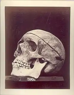 ![]() 1870s American male skull. The angle of the mandible is visible just above the white number. | |