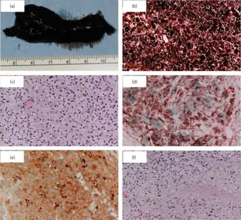 | Animal-type malignant melanoma-a) Macroscopy of the extracted orbital tumor b)melanin-containing cells are abundant in tumor c)diffuse proliferation of the epithelioid cells d)positive for atypical cells e)positive for atypical cells f) vast areas of necrosis | |