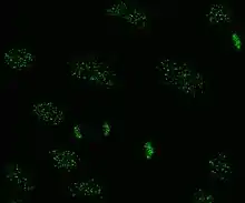 There are many nuclear staining patterns seen on HEp-2 cells: homogeneous, speckled, nucleolar, nuclear membranous, centromeric, nuclear dot and pleomorphic. The homogeneous pattern is seen when the condensed chromosomes and interphase chromatin stain. This pattern is associated with anti-dsDNA antibodies, antibodies to nucleosomal components, and anti-histone antibodies. There are two speckled patterns: fine and coarse. The fine speckled pattern has fine nuclear staining with unstained metaphase chromatin, which is associated with anti-Ro and anti-La antibodies. The coarse staining pattern has coarse granular nuclear staining, caused by anti-U1-RNP and anti-Sm antibodies. The nucleolar staining pattern is associated with many antibodies including anti-Scl-70, anti-PM-Scl, anti-fibrillarin and anti-Th/To. Nuclear membrane staining appears as a fluorescent ring around the cell nucleus and are produced by anti-gp210 and anti-p62 antibodies. The centromere pattern shows multiple nuclear dots in interphase and mitotic cells, corresponding to the number of chromosomes in the cell. Nuclear dot patterns show between 13 and 25 nuclear dots in interphase cells and are produced by anti-sp100 antibodies. Pleomorphic pattern is caused by antibodies to the proliferating cell nuclear antigen.[26][53][57][58] Indirect immunofluorescence has been shown to be slightly superior compared to ELISA in detection of ANA from HEp-2 cells.[54]