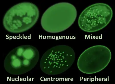 - ↑ Al-Mughales JA (2022). "Anti-Nuclear Antibodies Patterns in Patients With Systemic Lupus Erythematosus and Their Correlation With Other Diagnostic Immunological Parameters". Front Immunol. 13: 850759. doi:10.3389/fimmu.2022.850759. PMC 8964090. PMID 35359932.