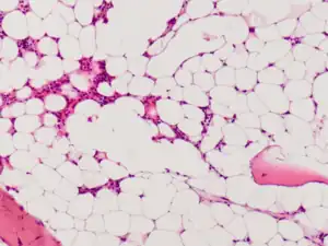 Micrograph of bone marrow taken from a person with aplastic anemia. The bone marrow is mostly fat cells with few blood forming cells.[2]