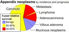 A carcinoid is a neuroendocrine tumor (NET) of the intestines.[12] Incidence rates among carcinoids occur at about .15 per 100,000 per year. This subgroup makes up a large amount of neoplasias both malignant and benign. Almost 3 out of 4 of these tumors are associated with the region at the end of the appendix, and tend to be diagnosed in the 4th to 5th decades in life. Both women and Caucasian individuals show a minor prevalence regarding neuroendocrine tumor diagnosis without an explanation.[13] Prognosis of 5 year survival rates of carcinoids averages between 70 and 80% for typical cases. Advanced cases for 5 year survival range from 12 to 28%.