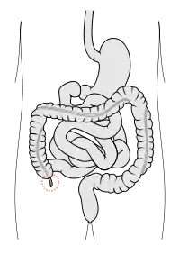 The appendix (pl.: appendices or appendixes; also vermiform appendix; cecal (or caecal) appendix; vermix; or vermiform process) is a finger-like, blind-ended tube connected to the cecum, from which it develops in the embryo. The cecum is a pouch-like structure of the large intestine, located at the junction of the small and the large intestines. The term "vermiform" comes from Latin and means "worm-shaped". The appendix was once considered a vestigial organ, but this view has changed since the early 2000s.[1][2] Research suggests that the appendix may serve an important purpose as a reservoir for beneficial gut bacteria.