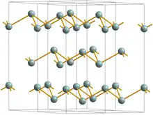 The three most common arsenic allotropes are grey, yellow, and black arsenic, with grey being the most common.[16] Grey arsenic (α-As, space group R3m No. 166) adopts a double-layered structure consisting of many interlocked, ruffled, six-membered rings. Because of weak bonding between the layers, grey arsenic is brittle and has a relatively low Mohs hardness of 3.5. Nearest and next-nearest neighbors form a distorted octahedral complex, with the three atoms in the same double-layer being slightly closer than the three atoms in the next.[17] This relatively close packing leads to a high density of 5.73 g/cm3.[18] Grey arsenic is a semimetal, but becomes a semiconductor with a bandgap of 1.2–1.4 eV if amorphized.[19] Grey arsenic is also the most stable form. Yellow arsenic is soft and waxy, and somewhat similar to tetraphosphorus (P4).[20] Both have four atoms arranged in a tetrahedral structure in which each atom is bound to each of the other three atoms by a single bond. This unstable allotrope, being molecular, is the most volatile, least dense, and most toxic. Solid yellow arsenic is produced by rapid cooling of arsenic vapor, As4. It is rapidly transformed into grey arsenic by light. The yellow form has a density of 1.97 g/cm3.[18] Black arsenic is similar in structure to black phosphorus.[18] Black arsenic can also be formed by cooling vapor at around 100–220 °C and by crystallization of amorphous arsenic in the presence of mercury vapors.[21] It is glassy and brittle. Black arsenic is also a poor electrical conductor.[22] As arsenic's triple point is at 3.628 MPa (35.81 atm), it does not have a melting point at standard pressure but instead sublimes from solid to vapor at 887 K (615 °C or 1137 °F).[4]