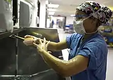 While all members of the surgical team should demonstrate good aseptic technique, it is the role of the scrub nurse or surgical technologist to set up and maintain the sterile field.[12][13] To prevent cross-contamination of patients, instruments are sterilized through autoclaving or by using disposable equipment; suture material or xenografts also need to be sterilized beforehand.[14] Basic aseptic procedures includes hand washing, donning protective gloves, masks and gowns, and sterilizing equipment and linens.[11] Medical aseptic techniques also includes curbing the spread of infectious diseases through quarantine, specifically isolation procedures based on the mode of disease transmission.[11] Within contact, droplet and airborne isolation methods, two different procedures emerge: strict isolation vs. reverse isolation.[11] Strict isolation quarantines patients to prevent them from infecting others, while reverse isolation prevents vulnerable patients from becoming infected.[11]