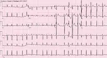 | Atrial fibrillation with rapid ventricular response; Ashman's phenomenon with RBBB aberrancy (13th beat) | |