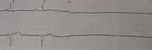 | A rhythm strip showing two beats of normal sinus rhythm followed by an atrial beat and asystole | |