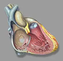 High in the upper part of the left atrium is a muscular ear-shaped pouch – the left atrial appendage (lat: auricula atrii sinistra). This appears to "function as a decompression chamber during left ventricular systole and during other periods when left atrial pressure is high".[9] It also modulates intravascular volume by secreting natriuretic peptides, namely atrial natriuretic peptide (ANP), and brain natriuretic peptide (BNP) into the coronary sinus, where they enter into the blood circulation.[10]