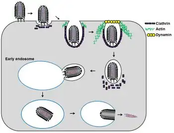 Lyssavirus host cell entry. Following attachment to host cell receptors, the virus particles are endocytosed via a clathrin- and dynamin- dependent pathway that requires actin polymerization for complete vesicle envelopment[3]