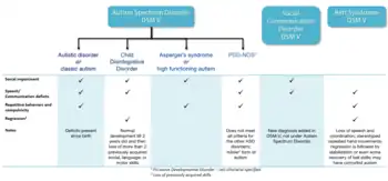 A revision to autism spectrum disorder (ASD) was presented in the Diagnostic and Statistical Manual of Mental Disorders version 5 (DSM-5), released May 2013.[21] The new diagnosis encompasses previous diagnoses of autistic disorder, Asperger syndrome, childhood disintegrative disorder, and PDD-NOS. Compared with the DSM-IV diagnosis of autistic disorder, the DSM-5 diagnosis of ASD no longer includes communication as a separate criterion, and has merged social interaction and communication into one category.[22] Slightly different diagnostic definitions are used in other countries. For example, the ICD-10 is the most commonly-used diagnostic manual in the UK and European Union.[23] Rather than categorizing these diagnoses, the DSM-5 has adopted a dimensional approach to diagnosing disorders that fall underneath the autism spectrum umbrella. Some have proposed that individuals on the autism spectrum may be better represented as a single diagnostic category. Within this category, the DSM-5 has proposed a framework of differentiating each individual by dimensions of severity, as well as associated features (i.e., known genetic disorders, and intellectual disability).