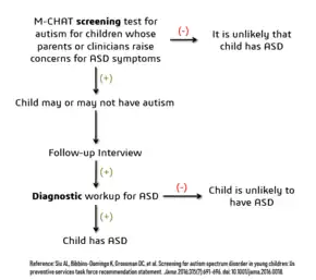 - 1 2 3 4 5 6 7 Siu, Albert L.; US Preventive Services Task Force (USPSTF); Bibbins-Domingo, Kirsten; Grossman, David C.; Baumann, Linda Ciofu; Davidson, Karina W.; Ebell, Mark; García, Francisco A. R.; Gillman, Matthew; Herzstein, Jessica; Kemper, Alex R. (16 February 2016). "Screening for Autism Spectrum Disorder in Young Children: US Preventive Services Task Force Recommendation Statement". JAMA. 315 (7): 691–696. doi:10.1001/jama.2016.0018. ISSN 1538-3598. PMID 26881372.