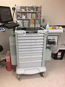An automated dispensing cabinet (ADC), also called a unit-based cabinet (UBC), automated dispensing device (ADD), or automated dispensing machine (ADM), is a computerized medicine cabinet for hospitals and healthcare settings. ADCs allow medications to be stored and dispensed near the point of care while controlling and tracking drug distribution.