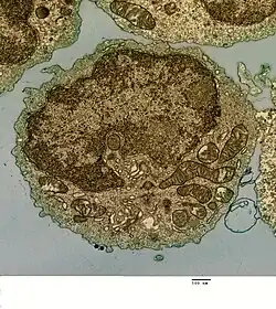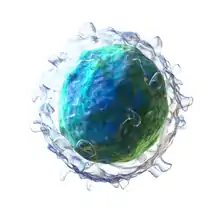 B cells, also known as B lymphocytes, are a type of white blood cell of the lymphocyte subtype.[1] They function in the humoral immunity component of the adaptive immune system.[1] B cells produce antibody molecules which may be either secreted or inserted into the plasma membrane where they serve as a part of B-cell receptors.[2] When a naïve or memory B cell is activated by an antigen, it proliferates and differentiates into an antibody-secreting effector cell, known as a plasmablast or plasma cell.[2] In addition, B cells present antigens (they are also classified as professional antigen-presenting cells, APCs) and secrete cytokines.[1] In mammals, including marsupials [3] B cells mature in the bone marrow, which is at the core of most bones.[4] In birds, B cells mature in the bursa of Fabricius, a lymphoid organ where they were first discovered by Chang and Glick,[5] which is why the B stands for bursa and not bone marrow, as commonly believed.