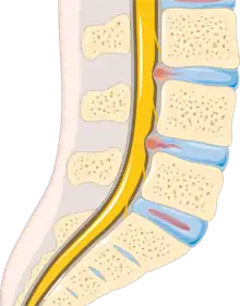 Spinal disc disease occurs when the nucleus pulposus, a gel-like material in the inner core of the vertebral disc, ruptures.[19] Rupturing of the nucleus pulposus can lead to compression of nerve roots.[20] Symptoms may be unilateral or bilateral, and correlate to the region of the spine affected. The most common region for spinal disk disease is at L4–L5 or L5–S1.[20] The risk for lumbar disc disease is increased in overweight individuals because of the increased compressive force on the nucleus pulposus, and is twice as likely to occur in men.[19][21] A 2002 study found that lifestyle factors such as night-shift work and lack of physical activity can also increase the risk of lumbar disc disease.[22]