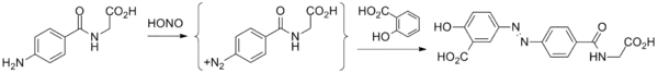 - Starting material is 4-aminohippuric acid, obtained by coupling para-aminobenzoic acid and glycine.