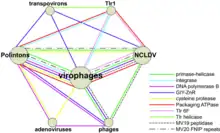 The genetic network linking various types of Bamfordvirae viruses and selfish genetic elements, represented by labeled circles. Links between circles are color-coded by the gene whose sequence homology establishes the link.[1]
