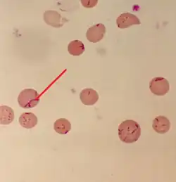 As the sandflies bite, the bacteria are inoculated into the capillaries, where in a variable period of time (around 21 days) it invades the red blood cells producing severe intravascular hemolytic anemia (acute phase of Carrion's disease).[6] This phase is a potentially life-threatening infection, and it is associated with high fever, anemia, and transient immunosuppression. The acute phase typically lasts two to four weeks. Peripheral blood smears show anisomacrocytosis with many coccobacilli adhered to red blood cells. Thrombocytopenia is also seen and can be severe. Neurological involvement is sometimes seen (neurobartonellosis) and the prognosis in this case is poor. The most feared complications are super-infections, mainly by enterobacteria such as Salmonella, or parasites such as Toxoplasma gondii and Pneumocystis.