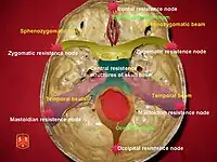 Base of the skull. Inferior surface, attachment of muscles marked in red.