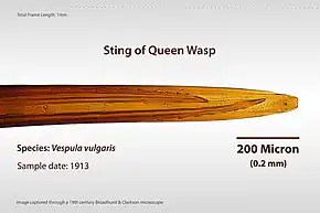 | The stinger of a honey bee separated from the body and attached to a protective dressing | |