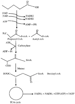 Propionyl-CoA is first carboxylated using a bicarbonate ion into a D-stereoisomer of methylmalonyl-CoA. This reaction involves a biotin co-factor, ATP and the enzyme propionyl-CoA carboxylase.[6] The bicarbonate ion's carbon is added to the middle carbon of propionyl-CoA, forming a D-methylmalonyl-CoA. However, the D-conformation is enzymatically converted into the L-conformation by methylmalonyl-CoA epimerase. It then undergoes intramolecular rearrangement, which is catalyzed by methylmalonyl-CoA mutase (requiring B12 as a coenzyme) to form succinyl-CoA. The succinyl-CoA formed then enters the citric acid cycle.