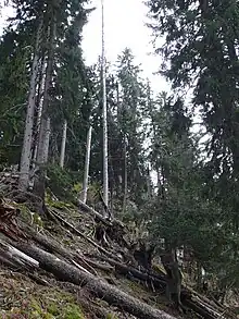 Old trees absorb more CO2 than young trees, because of the larger leaf area in full grown trees.[73] However, the old forest (as a whole) will eventually stop absorbing CO2 because CO2 emissions from dead trees cancel out the remaining living trees' CO2 absorption.[lower-alpha 51] The old forest (or forest stands) are also vulnerable for natural disturbances that produces CO2. The IPCC found that "[...] landscapes with older forests have accumulated more carbon but their sink strength is diminishing, while landscapes with younger forests contain less carbon but they are removing CO2 from the atmosphere at a much higher rate [...]."[62]: 386
