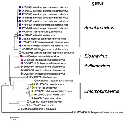 - ↑ Delmas, B; Attoui, H; Ghosh, S; Malik, YS; Mundt, E; Vakharia, VN; Ictv Report, Consortium (January 2019). "ICTV virus taxonomy profile: Birnaviridae". The Journal of General Virology. 100 (1): 5–6. doi:10.1099/jgv.0.001185. PMID 30484762.