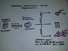As stated above, there are several different types of organisms that can utilize a regenerative blastema as an adult. These organisms include urodele amphibians, zebrafish, and planarian flatworms as major creatures of study. In flatworms, the formation of a blastema needs adult stem cells that are called neoblasts for any type of regeneration to occur.[11] Flatworms use these undifferentiated cells for regeneration after paracrine factors can provide signals from the surface of the wound. The cells in the blastema are also referred to as clonogenic neoblasts (cNeoblasts) that are able to move to the site of the wound and reform the tissue.[12] In urodele amphibians, studies suggest that dedifferentiation of cells leads to the formation of a blastema that is able to form multiple tissue types after the amputation of their tails and wound healing occurs.[13][14] In zebrafish, and in general, it seems as if experts are still uncertain of what truly forms the blastema. However, two common theories that have often been expressed are cell dedifferentiation and the recruitment of stem cells to the wound site.[15]