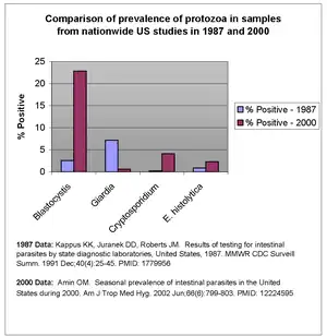 • Prevalence over Time: A 1989 study of the prevalence of Blastocystis in the United States found an infection rate of 2.6% in samples submitted from all 48 states.[49] The study was part of the CDC's MMWR Report. A more recent study, in 2006, found an infection rate of 23% in samples submitted from all 48 states. However, the more recent study was performed by a private laboratory located in the Western US, and emphasized samples from Western states, which have previously been reported to have a higher infection rate.[49]